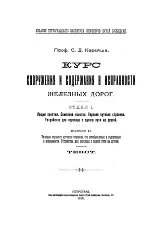Карейша С. Д. Курс сооружения и содержания в исправности железных дорог [Электронный ресурс]. Отд.1 : Общие понятия. Земляное полотно. Верхнее путевое строение. Устройства для перехода с одного пути на другой, вып. 2. Укладка верхнего путевого строения, его возобновление и содержание в исправности, 1919. - 704 с.
