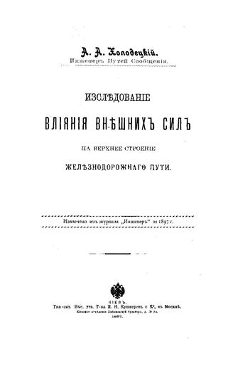 Холодецкий А.А. Исследование влияния внешних сил на верхнее строение железнодорожного пути. - , 1897.
