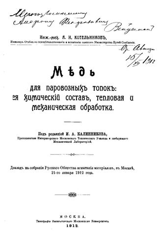 Котельников А.И. Медь для паровозных топок: её химический состав, тепловая и механическая обработка : докл. на собрании Рус. о-ва испытания материалов, в Москве, 21 янв. 1912 г / Под ред. И.А. Калинникова, 1912. - 37 с.