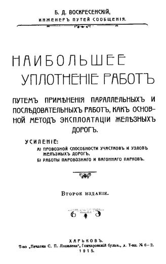 Воскресенский Б.Д. Наибольшее уплотнение работ путем применения параллельных и последовательных работ, как основной метод эксплуатации железных дорог. - Харьков, 1915.