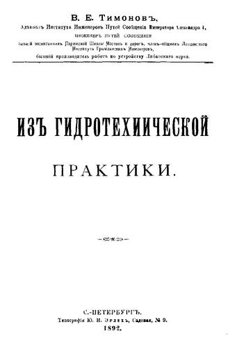 Тимонов В.Е. Первые морские землесосные работы в России, исполненные в Либавском и Виндавском портах в 1889 и 1890 годах, с приложением сведений о землесосных работах в Дюнкирхене и о теории землесосов / В. Е. Тимонов, 1892. - 187 с.