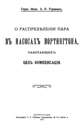 Герман А.П. О распределении пара в насосах Вортингтона, работающих без компенсации. - Петроград, 1917.