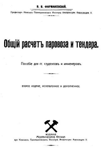 Фармаковский В. В. Общий расчет паровоза и тендера : пособие для студентов и инженеров / В. В. Фармаковский, 1912. - 127 с.
