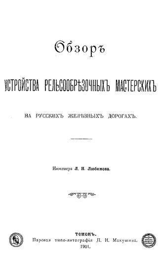 Любимов Л.Н. Обзор устройства рельсообрезочных мастерских на русских железных дорогах / Л. Н. Любимов, 1901. - 13 с.