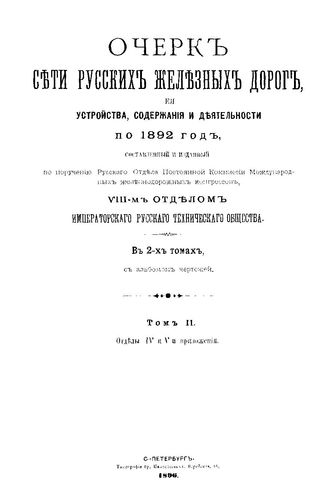 Очерк сети русских железных дорог, их устройства, содержания и деятельности по 1892 год, составленный и изданный по поручению Русского отдела Постоянной комиссии Международных железнодорожных конгрессов VIII-м отделом Императорского русского технического общества : В 2-х т. Т. 2 : Отделы 4 и 5 и приложения, 1896 паг.