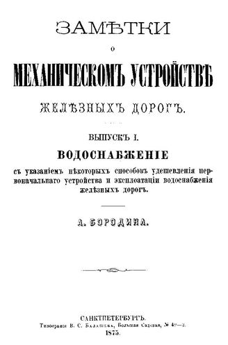 Заметки о механическом устройстве железных дорог А. Бородин. Вып. 1 : Водоснабжение с указанием некоторых способов удешевления первоначального устройства и эксплуатации водоснабжения железных дорог. - СПб., 1875.