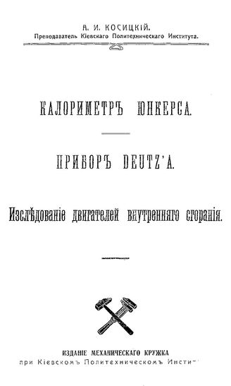 Косицкий А. И. Калориметр Юнкерса. Прибор Deutz'a. Исследование двигателей внутреннего сгорания / А. И. Косицкий, 1913. - 29 с.
