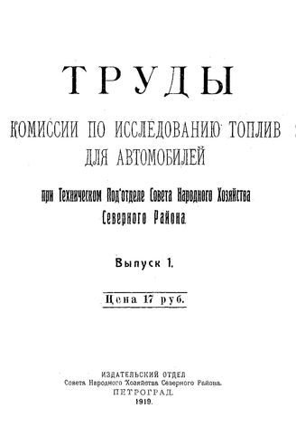Труды Комиссии по исследованию топлив для двигателей внутреннего сгорания при Петроградском отделении Научно-технического отдела ВСНХ. Вып. 1-(2), 1919. - 90 с.
