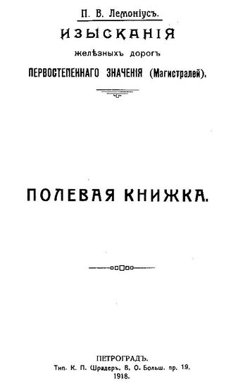 Лемониус П.В. Изыскания железных дорог первостепенного значения (магистралей) : полевая книжка / П. В. Лемониус, 1918. - 126 с.