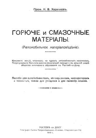 Харичков К.В. Горючие и смазочные материалы. (Автомобильное материаловедение) : конспект лекций, читан. на Курсах автомоб. механиков Петроград. ком. воен.-техн. помощи и в Вольн. шк. О-ва хим. образования в Ростове н/Д: пособие для автомобилистов, коммерсантов, кооператоров и техников, также для учащихся и для самообразования / К. В. Харичков, 1919. - 32 с.