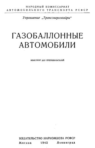 Газобалонные автомобили : конспект для преподавателей / Упр. "Трансэнергокадры", 1942. - 92 с.