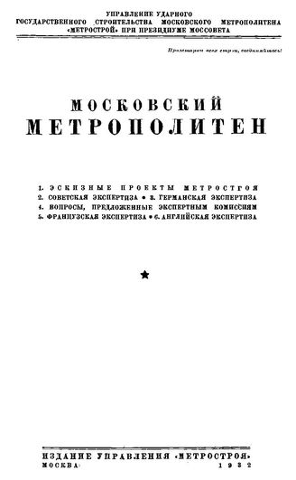 Московский метрополитен : полный свод заключений экспертных комиссий / Упр. ударного гос. стр-ва Моск. метрополитена "Метрострой" при Президиуме Моссовета, 1932. - 1 с.