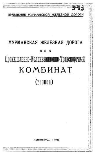 Мурманская железная дорога как промышленно-колонизационно-транспортный комбинат : тезисы / Правление Мурманской ж. д, 1926. - 7 с.
