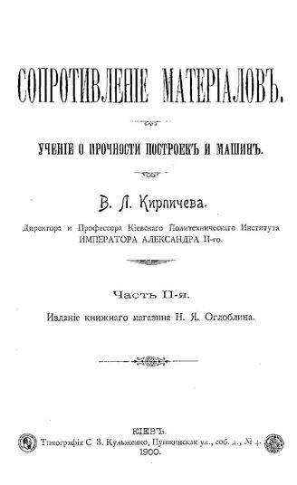 Кирпичев, В.Л. Сопротивление материалов. Учение о прочности построек и машин. Ч. 2. - Киев, 1900.