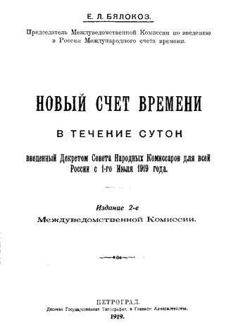 Бялокоз Е.Л. Новый счет времени в течении суток введенный декретом Совета народных комиссаров для всей России с 1-го июля 1919 г.. - Петроград, 1919.