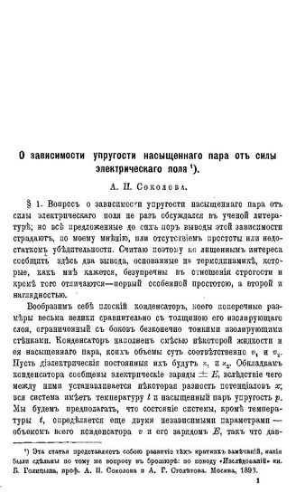 Соколов А.П. О зависимости упругости насыщенного пара от силы электрического поля / А. П. Соколов, 1893. - 11 с.