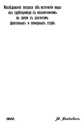Ясюкович М. Исследование вопроса об истечении воды из трубопровода с наконечником в связи с расчетом фонтанных и пожарных струй. - Б. м., 1908.