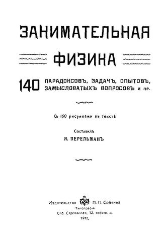 Перельман Я. Занимательная физика. 140 парадоксов, задач, опытов, замысловатых вопросов и пр.. - СПб., 1913.