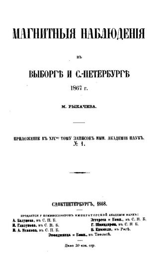 Рыкачев М. Магнитные наблюдения в Выборге и С.-Петербурге, 1867 г.. - СПб., 1868.