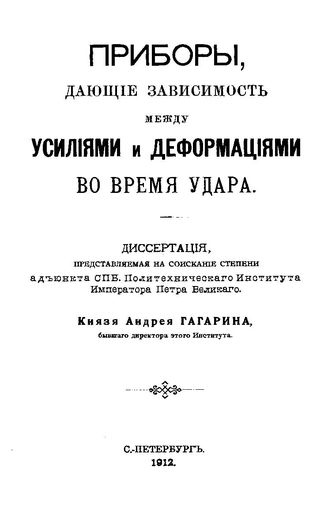 Гагарин А. Приборы, дающие зависимость между усилиями и деформациями во время удара : диссертация, представляемая на соискание степени адьюнкта СПБ Политехн. ин-та Императора Петра Великого / А. Гагарин, 1912. - 193 с.