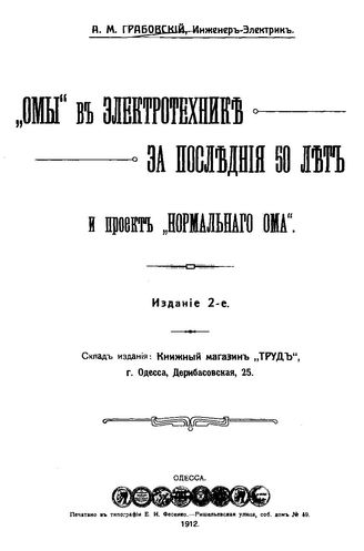 Грабовский А.М. "Омы" в электротехнике за последние 50 лет и проект "нормального ома". - Одесса, 1912.