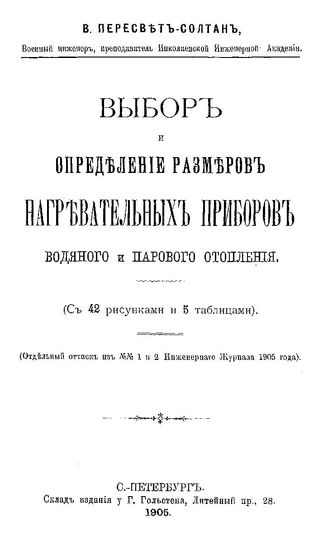 Пересвет-Солтан В. Выбор и определение размеров нагревательных приборов водяного и парового отопления. - СПб., 1905.