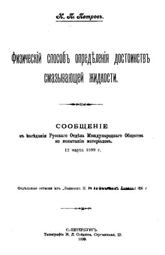 Петров Н.П. Физический способ определения достоинств смазывающей жидкости. - СПб., 1899.