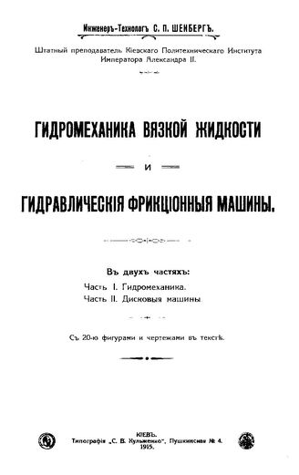 Штенберг С.П. Гидромеханика вязкой жидкости и гидравлические фрикционные машины. - Киев, 1915.