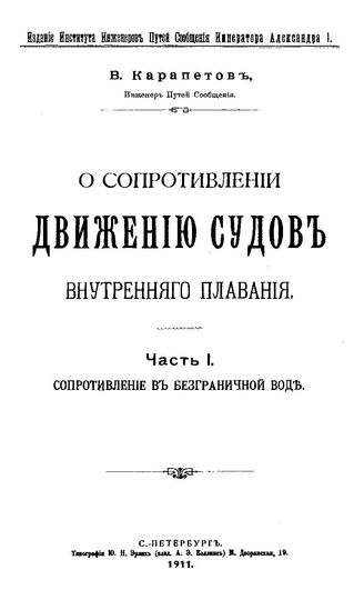 О сопротивлении движению судов внутреннего плавания / В. Н. Карапетов. Ч. 1 : Сопротивление в безграничной воде, 1911. - 122 122 с.