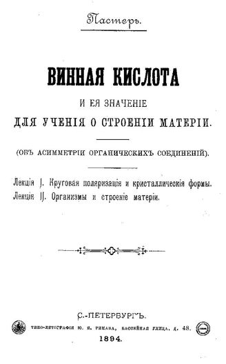 Пастер Л. Винная кислота и ее значение для учения о строении материи. (Об асимметрии органических соединений) [Электронный ресурс] : Лекция 1. Круговая поляризация и кристаллические формы. Лекция 2. Организмы и строение материи / Л. Пастер, 1894. - 36 с.
