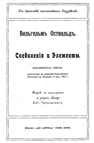 Оствальд В. Соединения и элементы [Электронный ресурс] : фарадеевская лекция, прочит. в аудитории Королев. ин-та в Лондоне 19 апр. 1904 г. / В. Оствальд; пер. с нем. Е. Троповский, 1909. - 36 с.