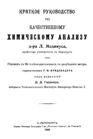 Медикус Л. Краткое руководство по качественному химическому анализу. - СПб., 1908.