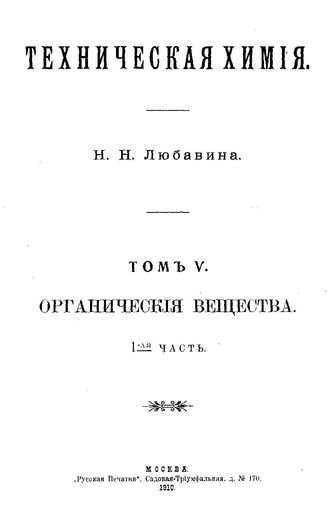 Любавин Н.Н. Техническая химия [Электронный ресурс]. Т. 5 : Органические вещества, Ч. 1, 1910. - 813 с.