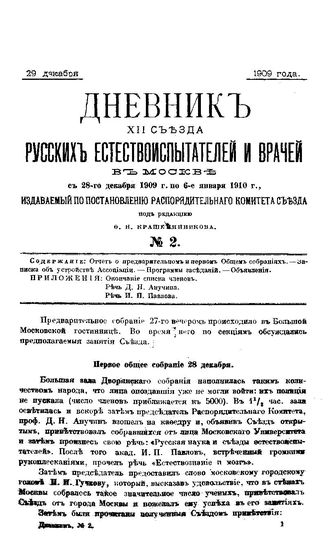 Дневник XII Съезда русских естествоиспытателей и врачей в Москве с 28 декабря 1909 г. по 6 января 1910 г. № 2. - М., 1909.