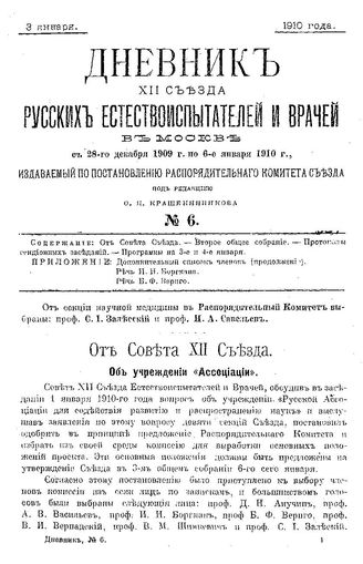 Дневник XII Съезда русских естествоиспытателей и врачей в Москве с 28 декабря 1909 г. по 6 января 1910 г. № 6. - М., 1910.