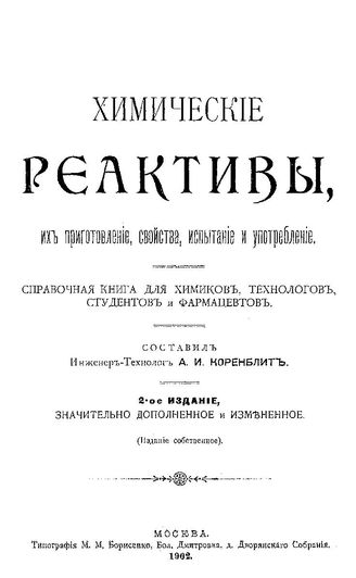 Коренблит А.И. Химические реактивы, их приготовление, свойства, испытание и употребление. - М., 1902.