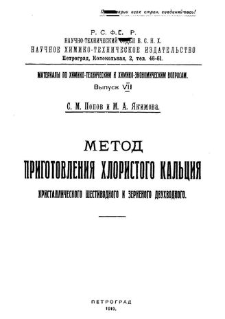 Материалы по химико-техническим и химико-экономическим вопросам / Науч.-технический отдел ВСНХ. Вып. 7 : Метод приготовления хлористого кальция кристаллического шестиводного и зерненого двухводного / С. М. Попов, М. А. Якимова, 1919. - 28 с.