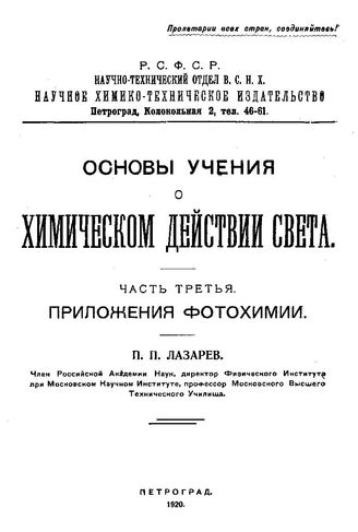 Основы учения о химическом действии света / П. П. Лазарев. Ч. 1 : Общая фотохимия, 1919. - 60 с.