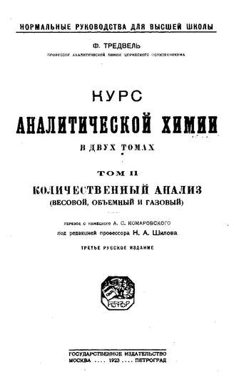 Курс аналитической химии : в 2-х т. / Ф. Тредвель ; пер. с нем. А. С. Комаровского с предисл. к первому рус. изд. М. И. Коновалова; под ред. Н. А. Шилова. - (Нормальные руководства для высшей школы). Т. 2 : Количественный анализ (весовой, объемный и газовый), 1923. - 572 с.