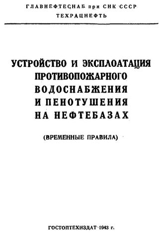 Временные правила по устройству и эксплуатации противопожарного водоснабжения и пенотушения на предприятиях Главнефтеснаба при СНК СССР. - М., 1943.