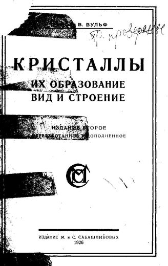Вульф Г.В. Кристаллы, их образование, вид и строение : монография / Г. В. Вульф, 1926. - 192.