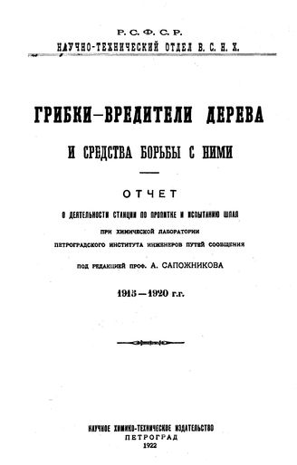 Грибки- вредители дерева и средства борьбы с ними : отчет о деятельности Станции по пропитке и испытанию шпал при Хим. лаб. Петроград. ин-та инженеров путей сообщ., 1915-1920 г.г. / под ред. А. Сапожникова, 1922. - 135 с.