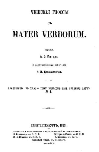 Патера А.О. Записки Императорской академии наук Императорская академия наук (Санкт-Петербург). Прил. № 4 к т. 31 : Чешские глоссы в MATER VERBORUM. - СПб., 1878.