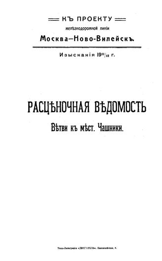 К проекту железнодорожной линии Москва - Ново-Вилейск. Изыскания 1911, 1912 г. Рыночная ведомость ветки к мест. Чашники, [1912]. - 24 c. с.