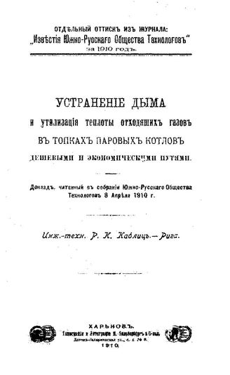 Каблиц Р.К. Устранение дыма и утилизация теплоты отходящих газов в топках паровых котлов дешевыми и экономическими путями : доклад,читан. в собрании Южно-Рус. о-ва технологов 8 апр. 1910 г. / Р. К. Каблиц, 1910. - 45 с.