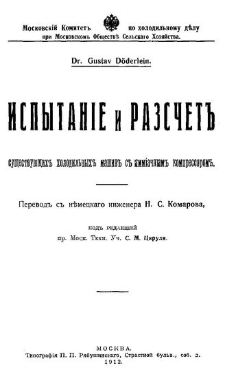 Doderlein G. Испытание и расчет существующих холодильных машин с аммиачным компрессором / G. Doderlein, 1912. - 89 с.