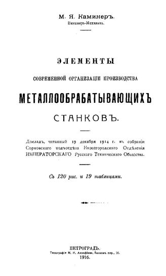 Каминер М.Я. Элементы современной организации производства металлообрабатывающих станков : доклад, читанный 19 дек. 1914 г. в собрании Сормовского подъотдела Нижегородского отделения Императорского Русского технического об-ва / М. Я. Каминер, 1916. - 87 с.