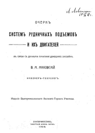 Маковский В.М. Очерк систем рудничных подъемов и их двигателей в связи с данными практики Донецкого бассейна. - Екатеринослав, 1909.