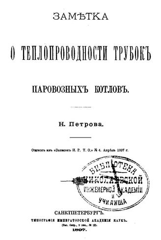 Петров Н. Заметка о теплопроводности трубок паровозных котлов. - СПб., 1897.