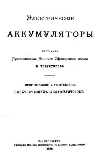 Тверитинов Е. Электрические аккумуляторы. Приготовление и употребление электрических аккумуляторов. - СПб., 1888.